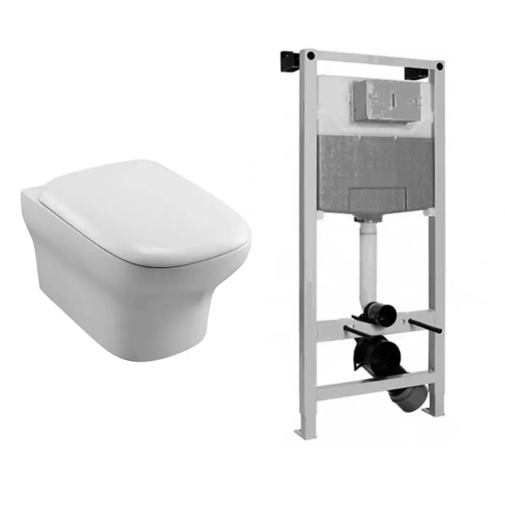 Настенная опорная рама с бачком со встроенным механизмом экономии воды 3/6 л (производство Португалия). В сборе (требуется несущая стена, крепления к полу и стене) для подвесных унитазов. Диаметр слива 90-110 мм.