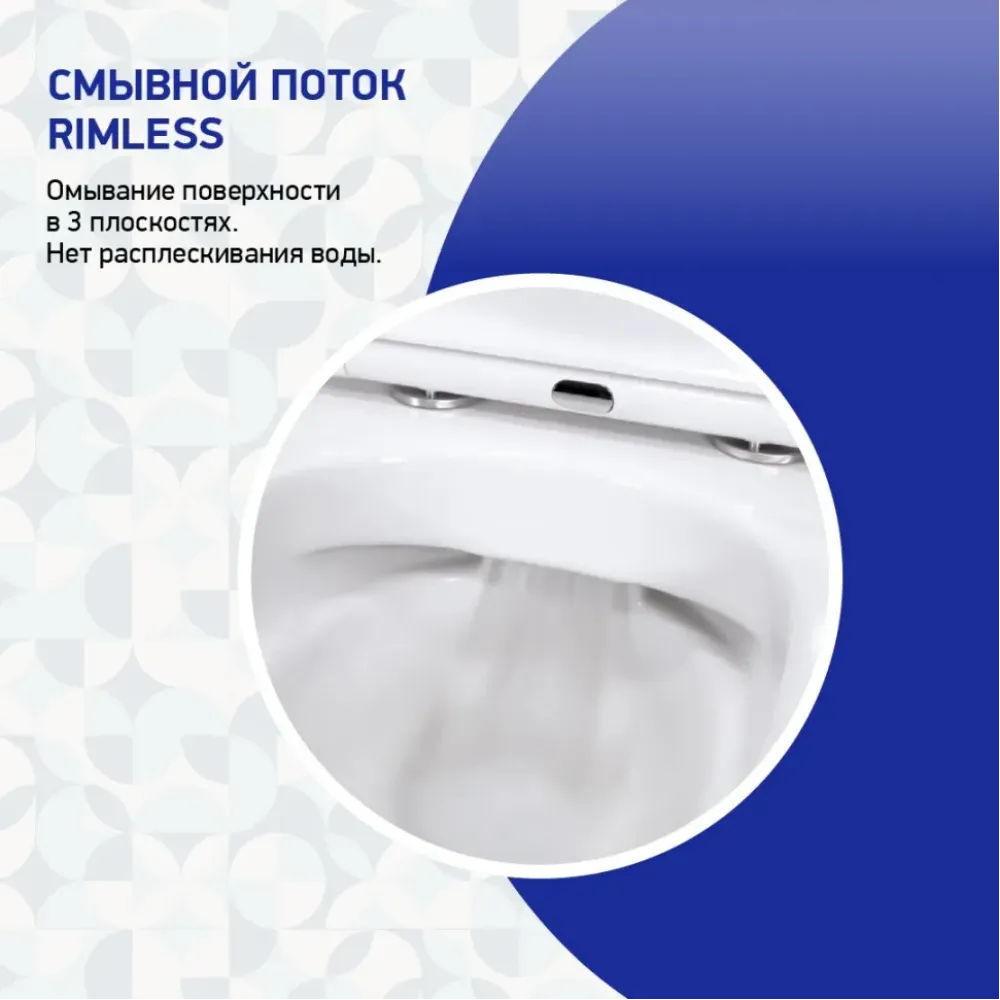 Смывной поток организован по системе Rimless - чаша имеет небольшои_ козырек, которыи_ предотвращает выплеск воды.