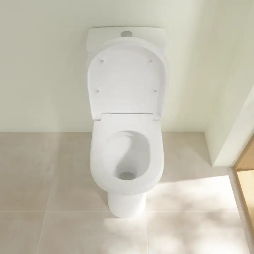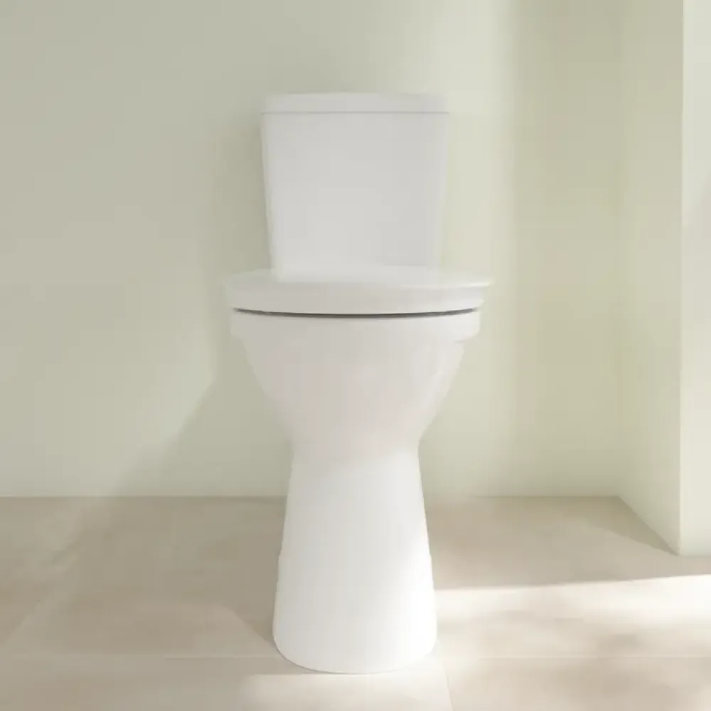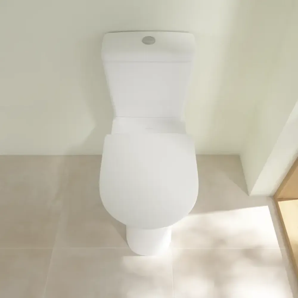 Комбинация для туалета включает в себя напольный унитаз и накладной сливной бачок. Они отлично подходят для разных видов и положений сточного отверстия. Villeroy & Boch предлагает различные соединительные отводы для установки, которые можно отрегулировать под любой размер. Эти модели преимущественно оснащены вертикальным смывом.