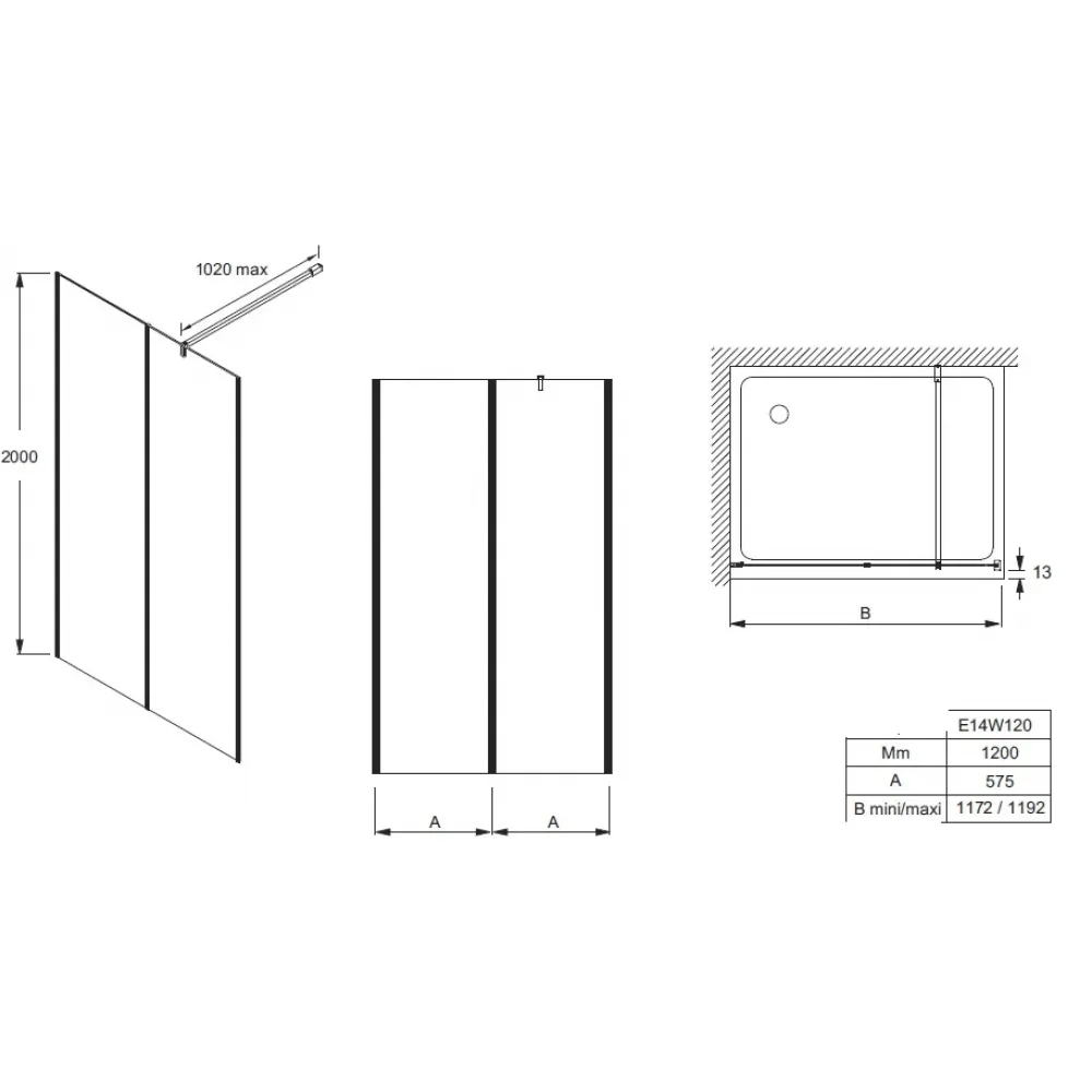 Технические характеристики Душевая перегородка Walk-In Serenity 120х200 см, анти-известковое покрытие, 6 мм, черный профиль E14W120-BLV Jacob Delafon