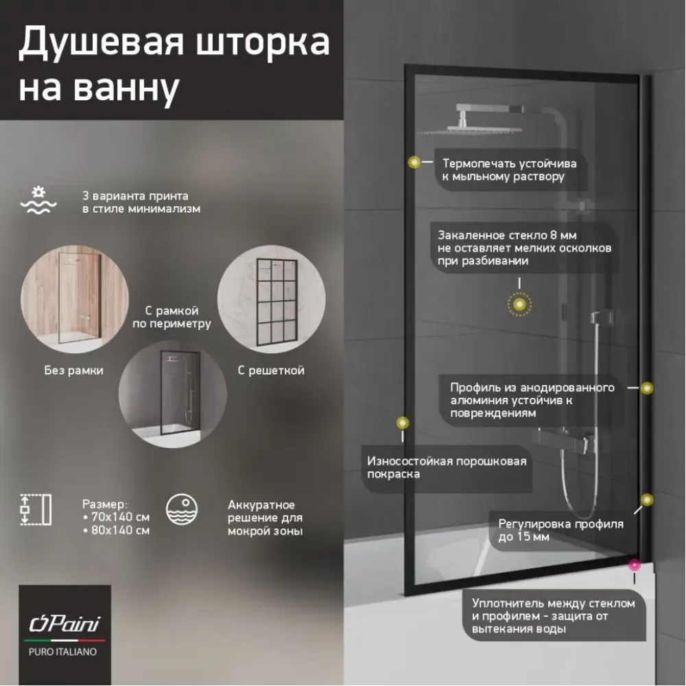 Надоели постоянно мокрые и мятые шторки для ванной и лужи на полу? Тогда стеклянная шторка для ванной от PAINI – то, что нужно! Пристенный профиль из анодированного алюминия надежно удерживает закаленное стекло с рисунком в виде решетки черного цвета. Такая конструкция защищает пол рядом с ванной от луж и брызг. Лаконичный дизайн, современные материалы, а также простота в уходе и безопасность – все это делает ширмы PAINI оптимальным решением, заменяющим тканевые и полиэтиленовые шторки для ванны.