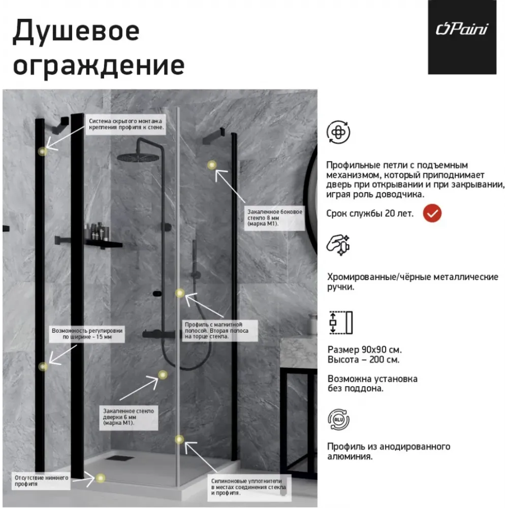 Высота изделий 200 см. позволяет делать установку без поддона. Преимущество конструктивных решений PAINI - отсутствие порогов в душевой зоне.