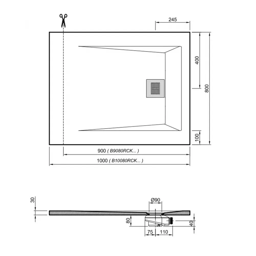 Даже при обрезке на месте сливное отверстие ROCKS остается по центру, на продольной оси поддона, что облегчает его установку.