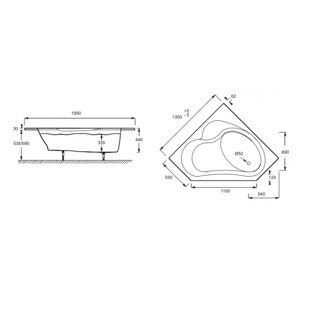 Технические характеристики Акриловая ванна Bain-douche 135х135 см, правосторонняя, угловая симметричная E6219-00 Jacob Delafon