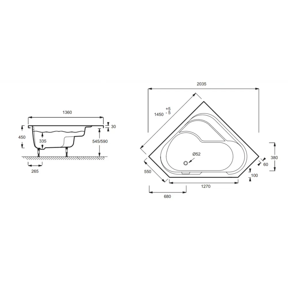 Технические характеристики Акриловая ванна Bain-douche 145х145 см, с антискользящим покрытием, левосторонняя, угловая симметричная E6222-00 Jacob Delafon