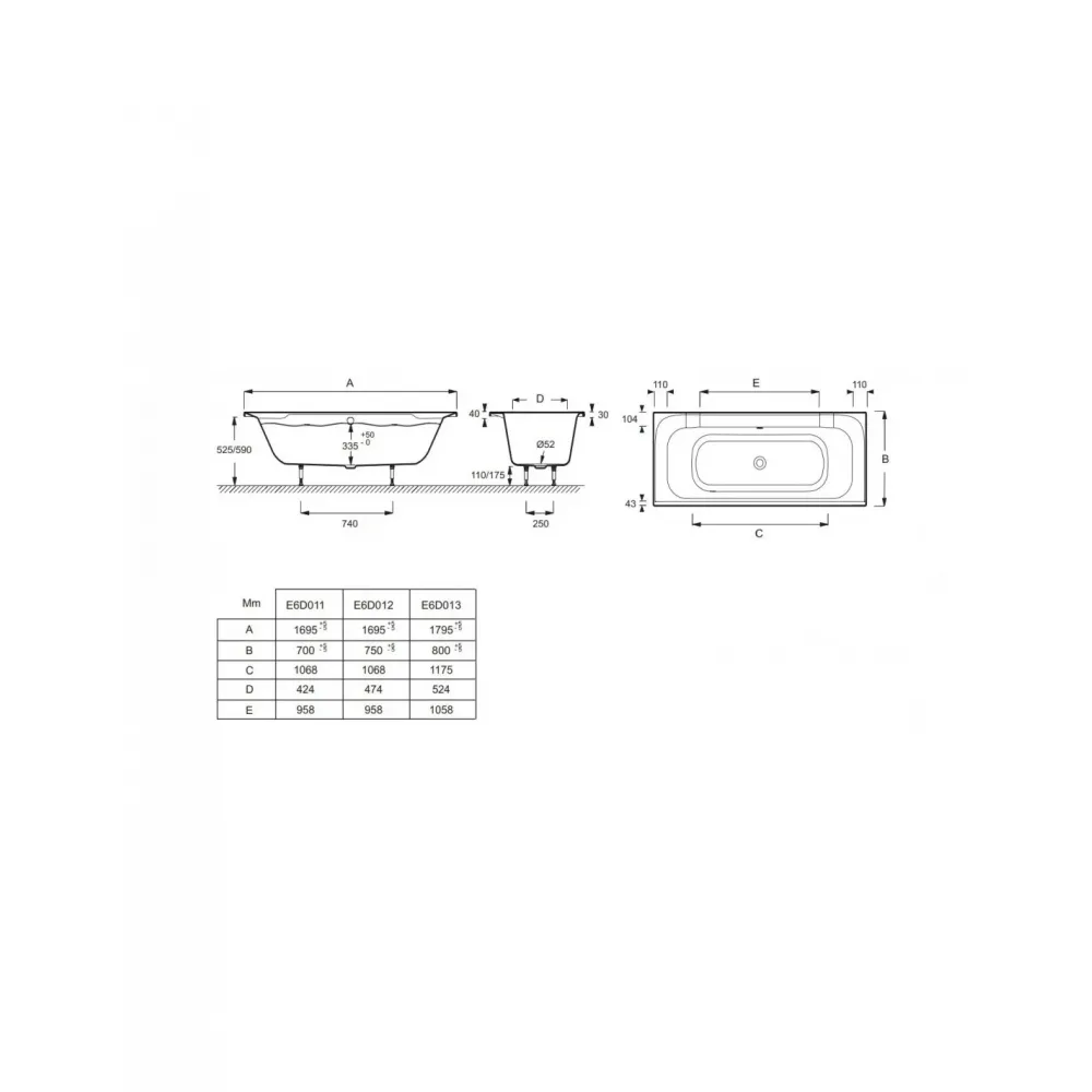 Ванна 170 х 70 см (E6D011) со специальным сливом в отделке Хром или Белый (E6D015).