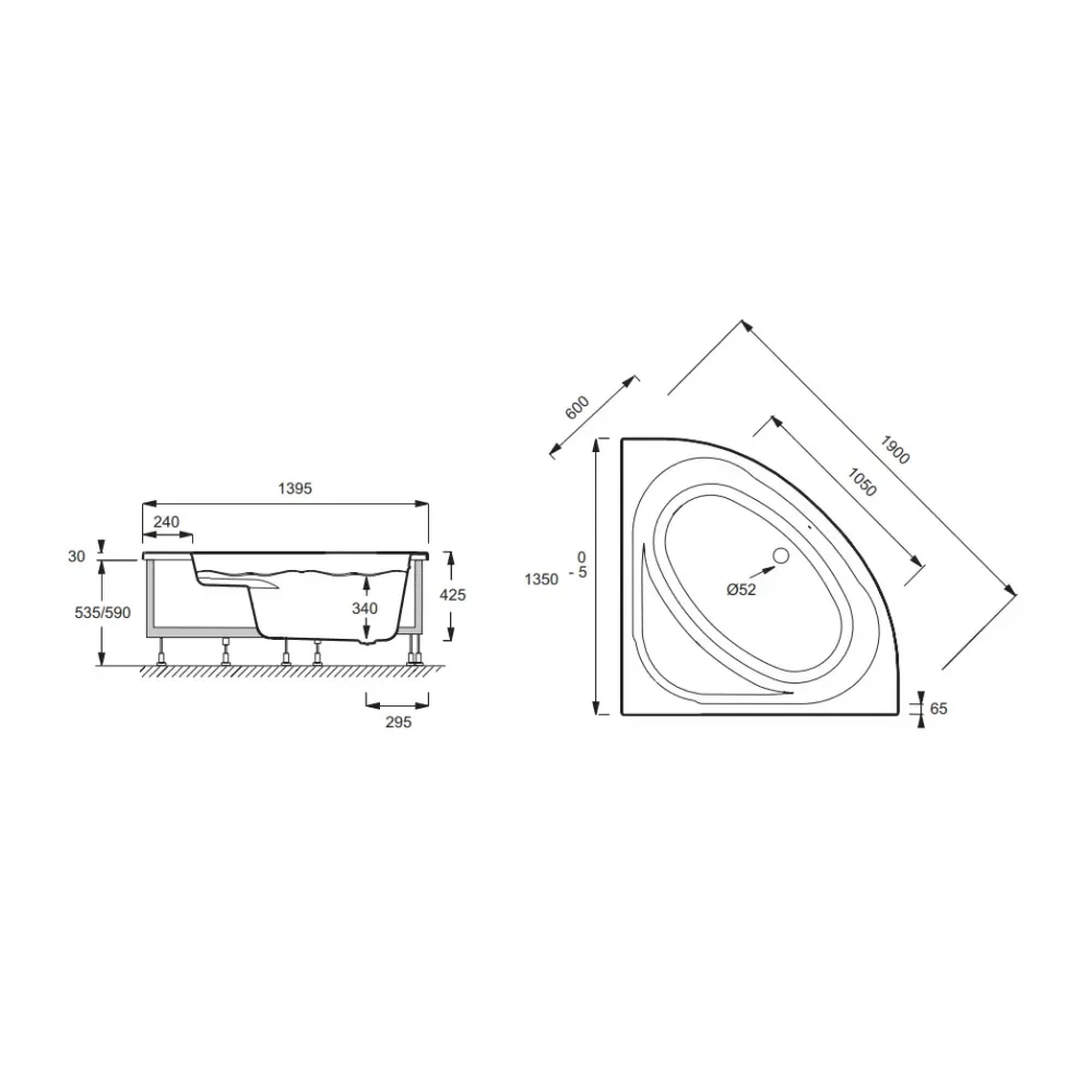 Технические характеристики Акриловая ванна Domo 135х135 см, с каркасом и фронтальной панелью, угловая симметричная E60224-00 Jacob Delafon