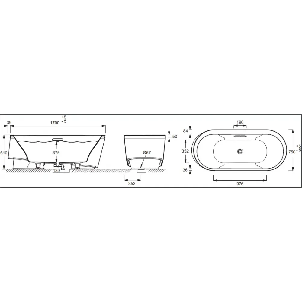 Овальная ванна (170 х 75 см), со специальным автоматическим сливом, панелью и поддерживающим профилем.