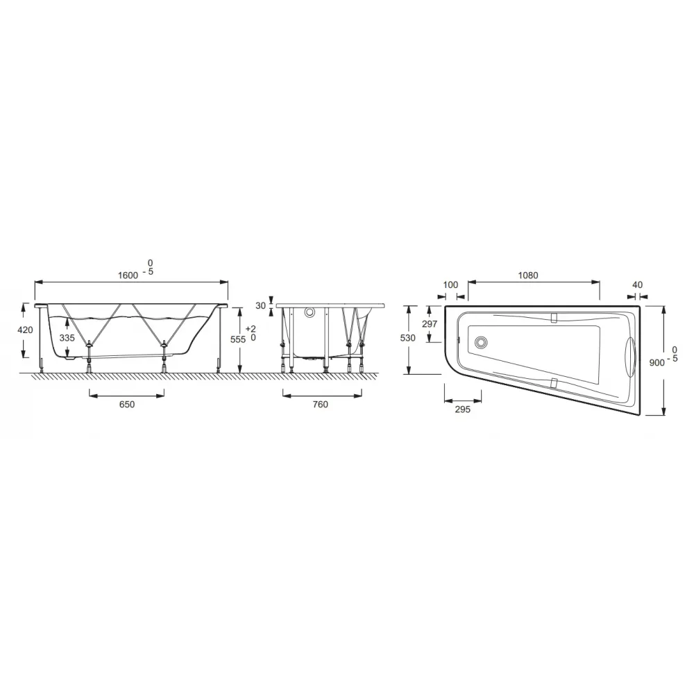 Технические характеристики Акриловая ванна Odeon Up 160х90 см, правосторонняя, с каркасом, ручками и подголовником, асимметричная E60811-00 Jacob Delafon