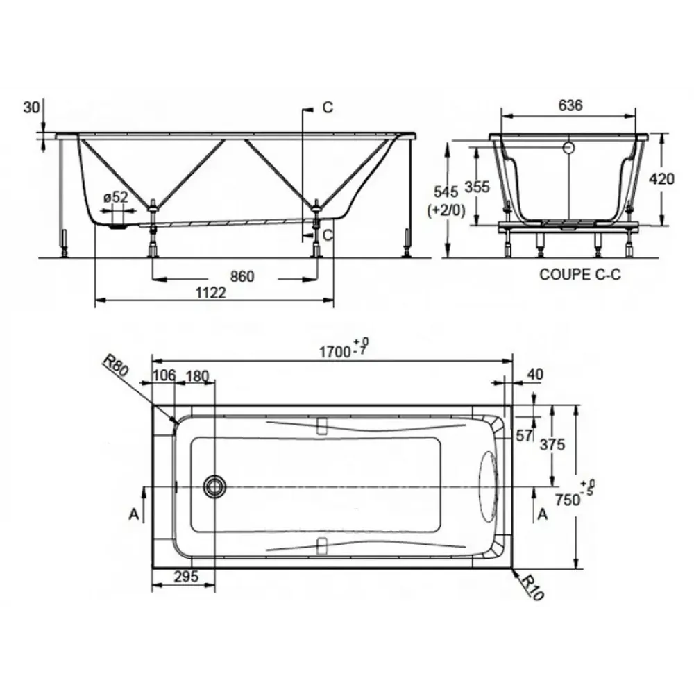 Технические характеристики Акриловая ванна Odeon Up 170х75 см E6D023-00 Jacob Delafon