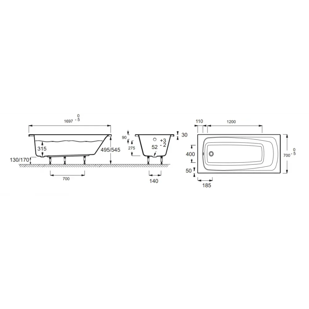 Технические характеристики Акриловая ванна Patio 170х70 см, белый лед E6812RU-01 Jacob Delafon