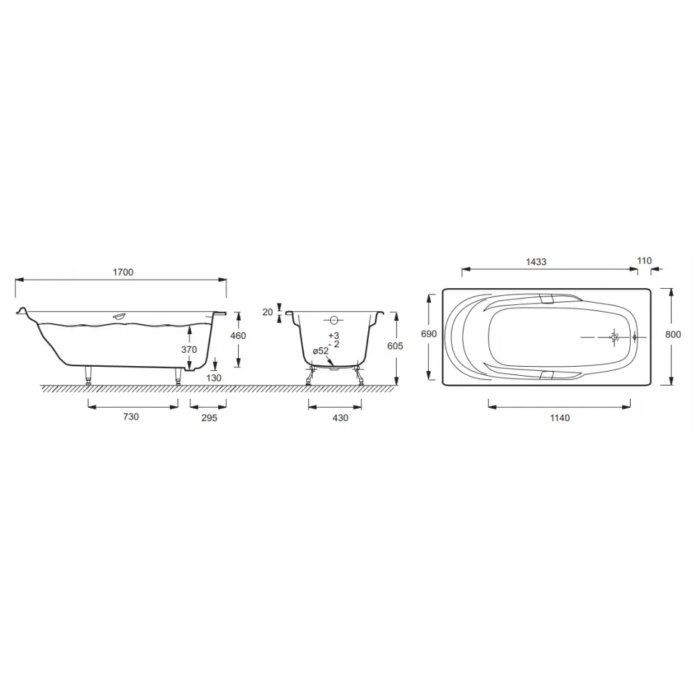 Технические характеристики Чугунная ванна Adagio 170х80 см, с отв. для ручек, антискользящее покр. E2910-00 Jacob Delafon