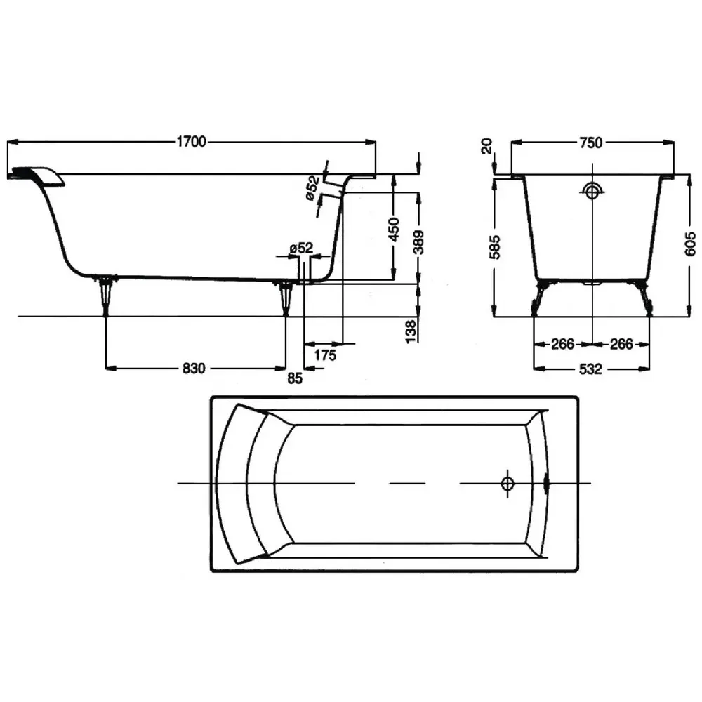 Технические характеристики Чугунная ванна Biove 170х75 см, антискользящее покр. E2930-00 Jacob Delafon