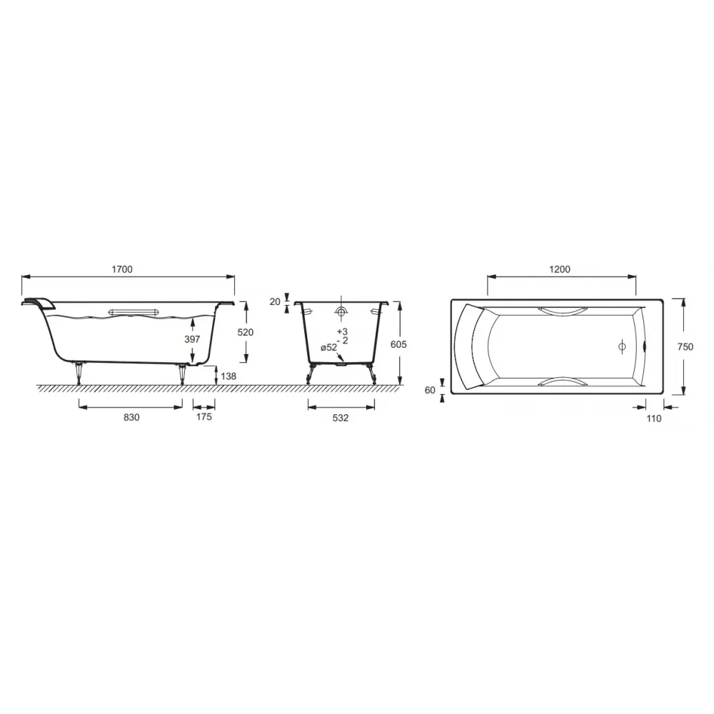 Технические характеристики Чугунная ванна Biove 170х75 см, с отв. для ручек, антискользящее покр. E2938-00 Jacob Delafon