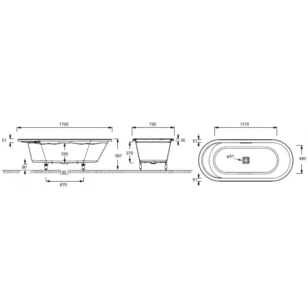Технические характеристики Чугунная ванна Lovee 170х75 см, с комплектом подключения, овальная, антискользящее покр. E9286-00 Jacob Delafon