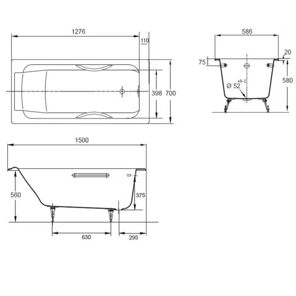Технические характеристики Чугунная ванна Parallel 150х70 см, антискользящее покр. E2946-00 Jacob Delafon