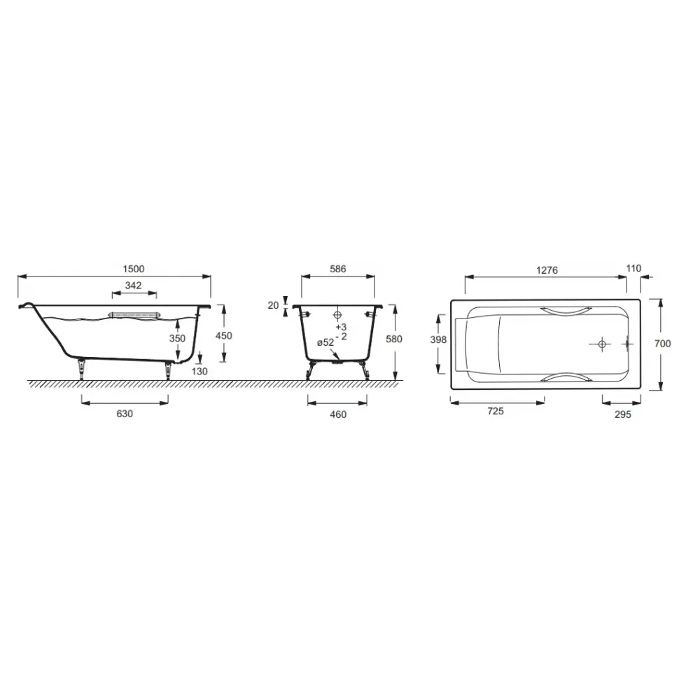 Технические характеристики Чугунная ванна Parallel 150х70 см, с отв. для ручек, антискользящее покр. E2949-00 Jacob Delafon