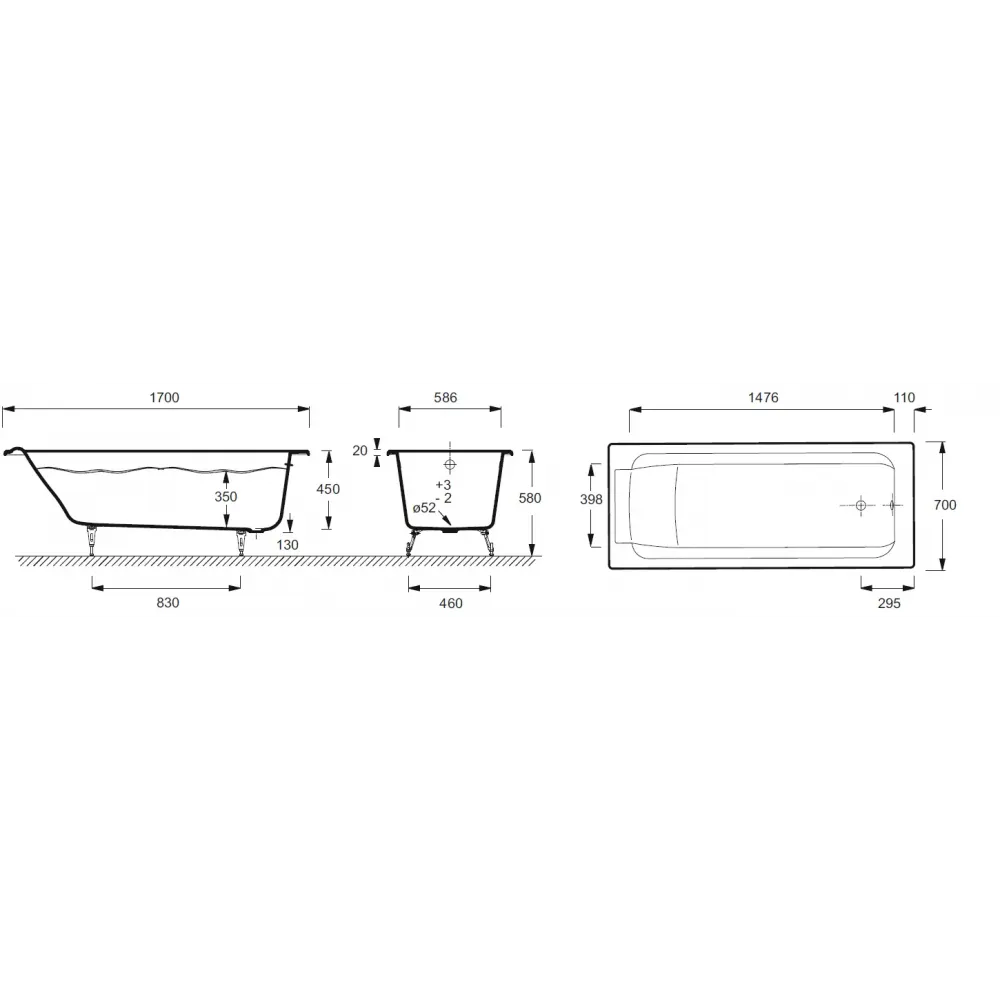Технические характеристики Чугунная ванна Parallel 170х70 см, без отверстий для ручек, без антискользящего E2947-S-00 Jacob Delafon