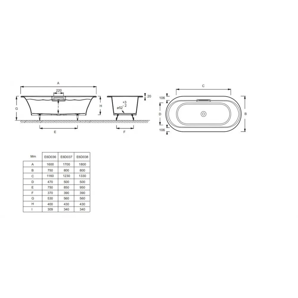 Технические характеристики Чугунная ванна Volute 160х75 см, встраиваемая, овальная, антискользящее покр. E6D036-00 Jacob Delafon