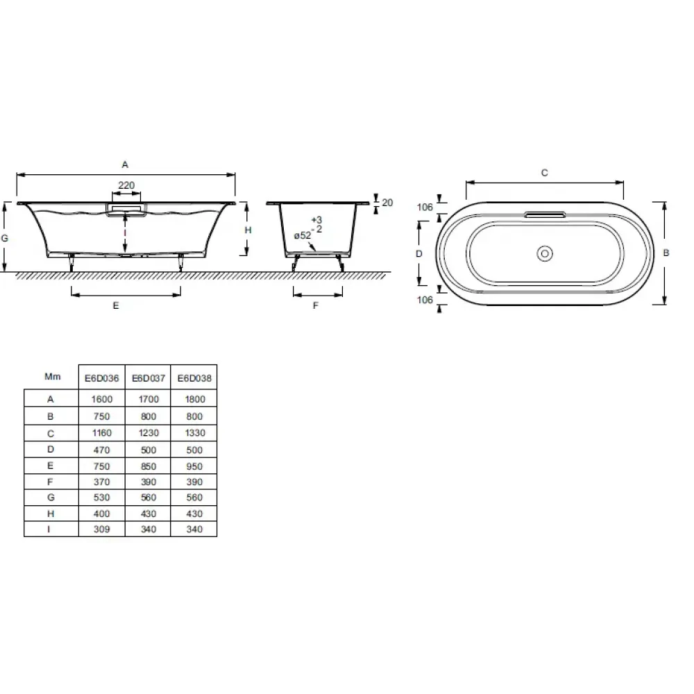 Технические характеристики Чугунная ванна Volute 170х80 см, овальная, антискользящее покр. E6D037-00 Jacob Delafon